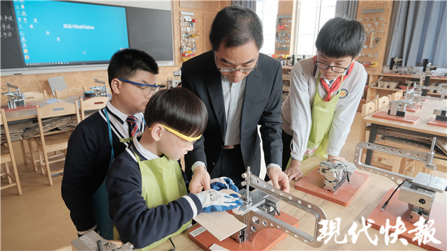 除了閱讀,維揚(yáng)實(shí)驗(yàn)小學(xué)還特別打造了500平米左右的STEM科創(chuàng)中心,內(nèi)設(shè)小魯班木工坊、科學(xué)實(shí)驗(yàn)室、教師交流區(qū)等,此外,學(xué)校根據(jù)各年級(jí)學(xué)生的特點(diǎn)自主開發(fā)了STEM系列課程,如《拯救小鳥》《智能灌溉》《智慧大棚》等,同時(shí)在班級(jí)層面建立以科學(xué)家名字命名的少科所,截至目前,學(xué)校學(xué)生共獲得了57項(xiàng)國家發(fā)明專利,有1000多人次獲省級(jí)以上科技競(jìng)賽獎(jiǎng)項(xiàng)。
