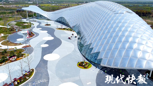 而走到園區(qū)的東北側(cè),遠(yuǎn)遠(yuǎn)就能看見(jiàn)的建筑也吸引了許多人氣,這就是被稱為“江豚”的國(guó)際館。國(guó)際館是揚(yáng)州世園會(huì)的“點(diǎn)睛之筆”,整個(gè)館高30多米,長(zhǎng)250多米。國(guó)際館的設(shè)計(jì)主題為“江海之戀”,靈感來(lái)源于長(zhǎng)江中的江豚,建筑造型喻意“江豚游弋”。這座“有生命、會(huì)呼吸”的綠色建筑會(huì)隨天氣、光線變幻色彩點(diǎn)亮世園會(huì),在開(kāi)園期間承擔(dān)國(guó)際花卉展示、花卉園藝競(jìng)賽、配套服務(wù)區(qū)等功能。