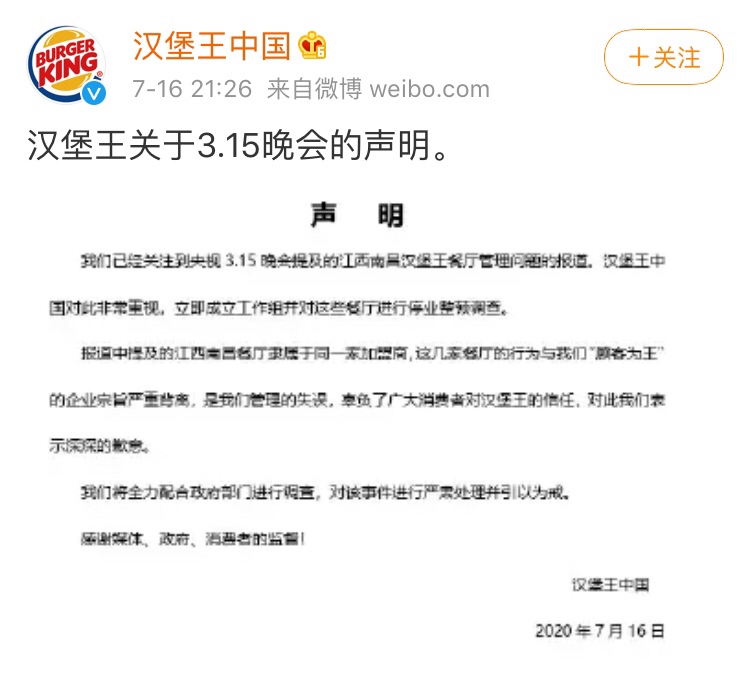 7月16日21點26分,漢堡王中國官方微博稱:我們已經(jīng)關(guān)注到央視3.15晚會提及的江西南昌漢堡王餐廳管理問題的報道。漢堡王中國對此非常重視,立即成立工作組并對這些餐廳進(jìn)行停業(yè)整頓調(diào)查。報道中提及的江西南昌餐廳隸屬于同一家加盟商,這幾家餐廳的行為與我們"顧客為王”的企業(yè)宗旨嚴(yán)重背離,是我們管理的失誤,辜負(fù)廣大消費者對漢堡王的信任,對此我們表示深深的歉意。我們將全力配合政府部門進(jìn)行調(diào)查,對該事件進(jìn)行嚴(yán)肅處理并引以為戒。感謝媒體、政府、消費者的監(jiān)督!