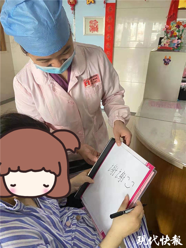 用眼神和紙筆進(jìn)行特殊又溫暖的“對(duì)話”,給了胡女士很大的信心,順利誕下一名女寶寶。“分娩完非常激動(dòng),她自己不會(huì)寫字,為了表達(dá)自己的謝意,所以她就照著手機(jī)寫了謝謝兩個(gè)字來(lái)感謝我們,還畫了一個(gè)笑臉,這個(gè)新年禮物讓我倍感溫暖,雖然是無(wú)聲的,但也讓我有了滿滿的職業(yè)自豪。”邵丹丹說(shuō)。