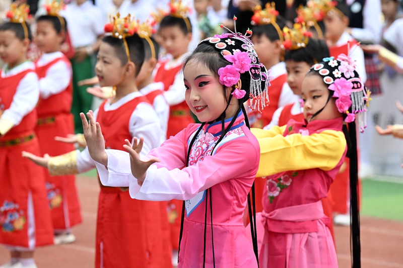 4月28日,學生在河北省石家莊市新華區(qū)西苑小學春季運動會上表演。新華社發(fā)(陳其保?攝)