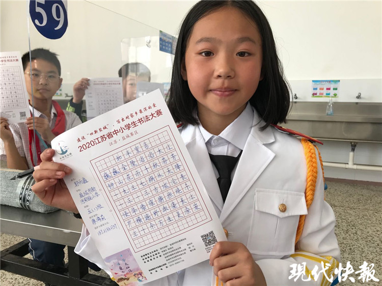 “孩子們抬頭挺胸,端正坐姿,正確握筆,一筆一畫書寫。”鹽城市新河實(shí)驗(yàn)小學(xué)的書法老師家徐萬(wàn)虎和萬(wàn)遠(yuǎn)峰、費(fèi)建、蔡紅梅等四位老師穿梭其中,指導(dǎo)孩子們認(rèn)真比賽。“媽媽很支持我,我每天都會(huì)抽時(shí)間練字。”四年級(jí)的學(xué)生孫雨婷雖然才練字1年時(shí)間,但她的字已顯成熟穩(wěn)重。