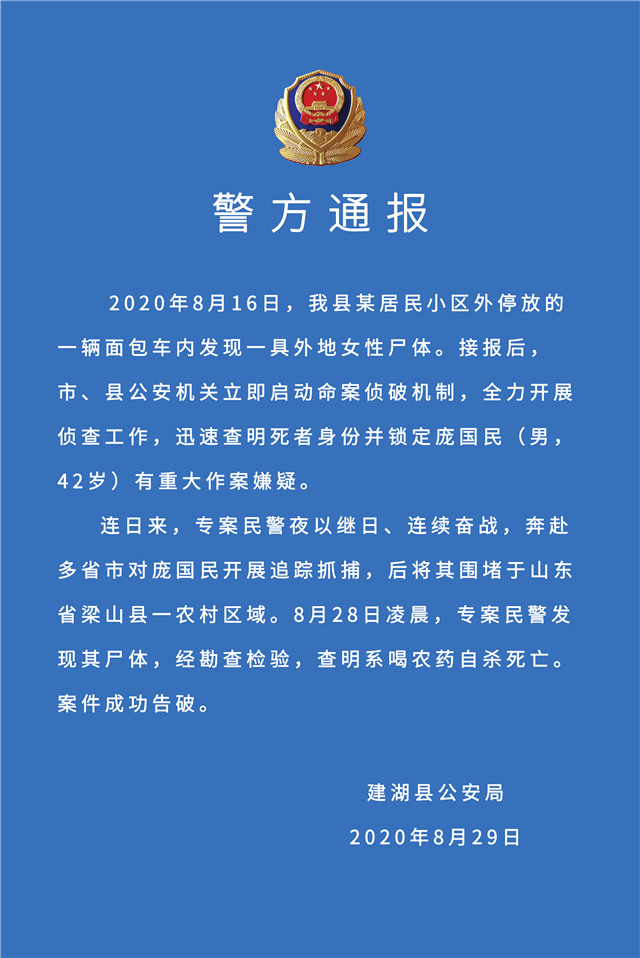 (記者 姜振軍)8月29日傍晚6時許,鹽城市建湖縣公安局發(fā)布警方通報稱,2020年8月16日,我縣某居民小區(qū)外停放的一輛面包車內(nèi)發(fā)現(xiàn)一具外地女性尸體。接報后,市、縣公安機(jī)關(guān)立即啟動命案偵破機(jī)制,全力開展偵查工作,迅速查明死者身份并鎖定龐國民(男,42歲)有重大作案嫌疑。