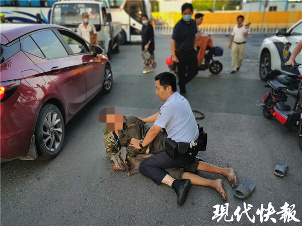 9月6日早晨,徐州泉山公安分局奎山派出所社區(qū)民警王瑋巡邏至解放路與奎山路交叉口時(shí),看到一男子站在路邊的交通標(biāo)志牌下,時(shí)不時(shí)地向路人和車(chē)輛揮舞棍子,腰間還塞著兩把菜刀和一把剪刀。