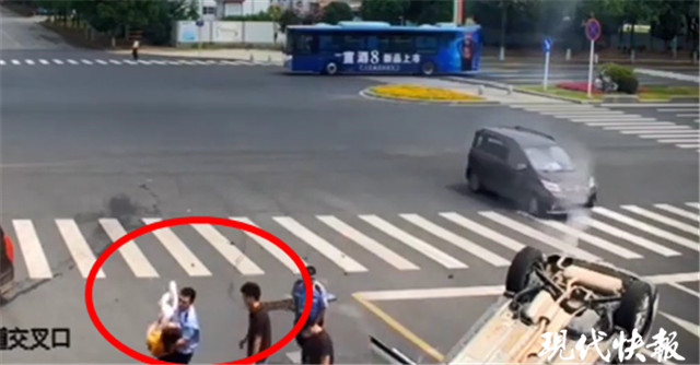 事情發(fā)生在9月11日中午12點多,在南京高淳區(qū)經(jīng)濟開發(fā)區(qū)的九龍山路與古檀大道交叉口,發(fā)生了一起交通事故。一輛白色私家車與一輛棕色私家車相撞,因為強大的沖擊力,白色私家車被撞了個“底朝天”。這時,剛從社區(qū)走訪返程的南京市公安局高淳分局古柏派出所民警、輔警,正駕車開往此路口。一聽到劇烈的碰撞聲,他們立即加大馬力開到該處路邊。