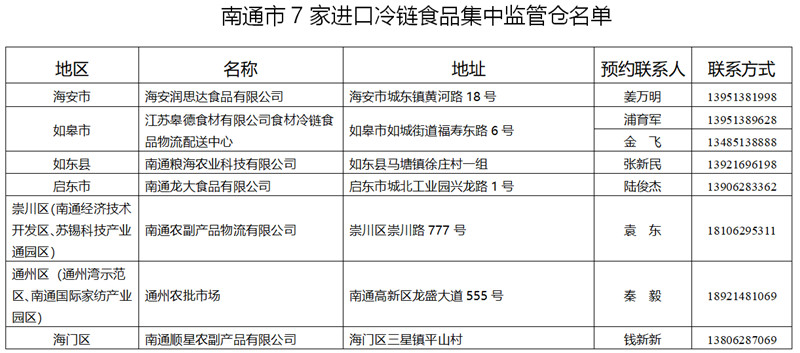 一、從2020年11月23日起,南通海安市、如皋市、如東縣、啟東市、崇川區(qū)、通州區(qū)、海門區(qū)各設(shè)立1個進口冷鏈食品集中監(jiān)管倉(以下簡稱“集中監(jiān)管倉”),南通經(jīng)濟技術(shù)開發(fā)區(qū)、蘇錫通科技產(chǎn)業(yè)園區(qū)與崇川區(qū)共用集中監(jiān)管倉,通州灣示范區(qū)、南通國際家紡產(chǎn)業(yè)園區(qū)與通州區(qū)共用集中監(jiān)管倉。集中監(jiān)管倉設(shè)置和運行根據(jù)實際需要,全市統(tǒng)籌,動態(tài)調(diào)整。