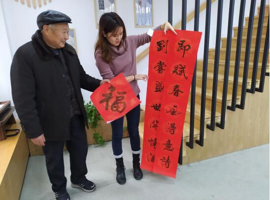 過(guò)新年、送福字、貼春聯(lián)是中華民族的傳統(tǒng)文化,是象征吉祥、表達(dá)人們向往美好生活的民族風(fēng)俗。在社區(qū)黨群服務(wù)站,只見(jiàn)桌上鋪滿了喜氣的大紅紙,張廣立老師鋪開(kāi)紙硯,筆酣墨香,龍飛鳳舞,一幅幅喜慶的對(duì)聯(lián)承載著滿滿的祝福,在他的手中隨筆而出??瑫?、隸書、行書、草書等作品風(fēng)格迥異,各具神韻,讓大家充分領(lǐng)略到書法藝術(shù)經(jīng)久不衰的魅力。