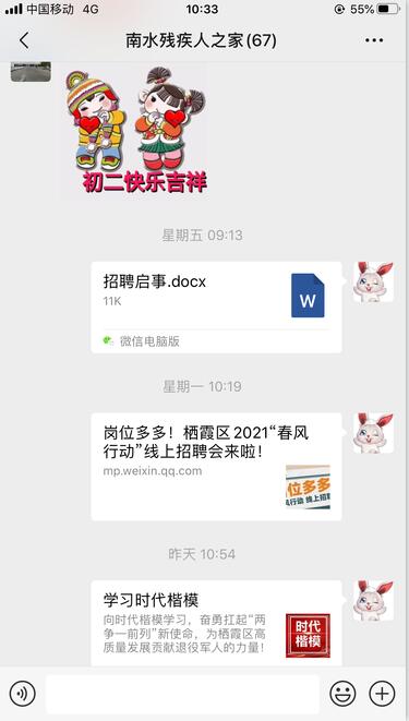 在“南水殘疾人之家”微信群中,社區(qū)殘聯(lián)工作人員在線上推送招聘會殘疾人用工招聘信息,為殘疾人求職者提供就業(yè)信息互通的渠道,幫助有就業(yè)意愿和就業(yè)能力的殘疾人實現(xiàn)就業(yè)創(chuàng)業(yè),全力保障特殊時期殘疾人獲取實時有效的就業(yè)服務。面對殘疾人求職者的就業(yè)創(chuàng)業(yè)政策咨詢,工作人員及時回復解答。“全程不見面,就業(yè)服務不間斷”南水新村社區(qū)依托電話、微信等媒介多舉措切實加強疫情期間的殘疾人就業(yè)服務工作,為殘疾人就業(yè)創(chuàng)業(yè)提供貼心服務,營造殘疾人就業(yè)創(chuàng)業(yè)的良好社會氛圍。
