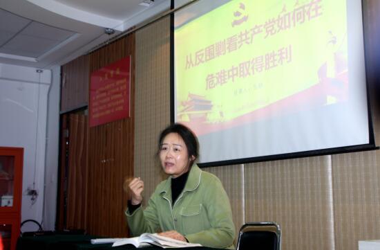 區(qū)干部張靜同志在課堂講解“黨在戰(zhàn)爭(zhēng)年代中如何取得勝利”黨史