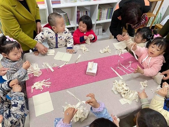 活動(dòng)中,中心老師引導(dǎo)家長、幼兒進(jìn)行了熱身活動(dòng)“魔袋尋寶”,組織大家通過“拉紅繩”的形式進(jìn)行分組,相互分工合作,很快就找到“寶藏”并順利完成任務(wù)。熱身游戲后的“手工剪紙做手工”環(huán)節(jié),志愿者為所有幼兒派發(fā)彩紙、剪刀、膠水等工具,并逐一示范每個(gè)操作步驟,“上下對折、左右對折、沿著虛線折......”幼兒們聽得格外認(rèn)真,個(gè)個(gè)都是躍躍欲試、大顯身手的模樣,迫不及待地?cái)[弄起手中的彩紙。在志愿者和家長的幫助下,幼兒們順利完成了自己的作品,自豪地向小伙伴炫耀起來?;顒?dòng)的最后,家長們跟著老師的指令帶著孩子們做起身體運(yùn)動(dòng),隨著歡樂的音樂,拍拍手、跺跺腳,轉(zhuǎn)圈圈…孩子們都開心極了,臉上洋溢著快樂的笑容。