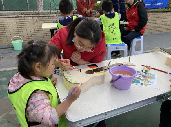 在專業(yè)老師的指導和家長的陪伴下,小朋友用手中的畫筆、五彩斑斕的顏料和天馬行空的想象力,一幅幅美好畫作躍然琴身,裝飾出獨屬于自己的尤克里里。