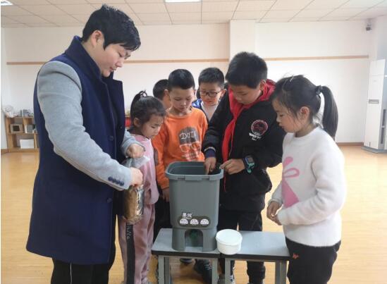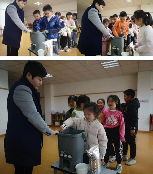 活動開始前,志愿者向孩子們講解“變廢為寶 自制堆肥”的步驟。首先準備了一個堆肥箱,放好墊板然后在墊板上撒一些菌種;放入濾干水分的廚余,并加菌種攪拌均勻,廚余可一次性放滿整桶,也可以分多次(多天)加滿;在發(fā)酵過程中,會產生液肥有機肥,可由堆肥箱下層水龍頭取出,待上層廚余發(fā)酵完畢,固態(tài)有機肥可從上層取出,做基肥或者追肥使用。