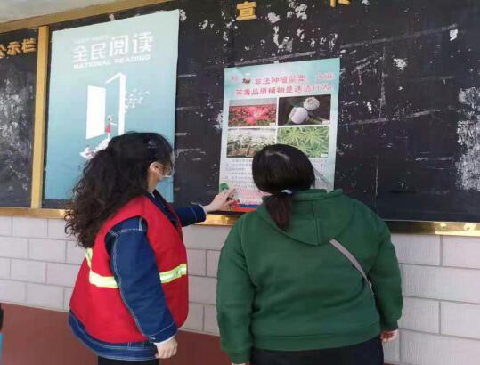 活動中,禁毒社工以及各轄區(qū)工作人員在轄區(qū)主要路段、人流量較多的地方以及一些場所的宣傳欄等比較醒目的位置張貼海報。通過海報宣傳傳遞禁毒工作信息,增進轄區(qū)居民對禁毒工作的了解,海報展示了非法種植罌粟、大麻等毒品原植物均屬于違法行為。通過禁毒相關知識描述了涉毒給個人、家庭以及社會帶來的危害,提高居民的識毒、防毒、拒毒能力,同時讓轄區(qū)居民更清晰地認識到毒品的危害,遠離毒品,增加拒毒、防毒的自我防范意識。