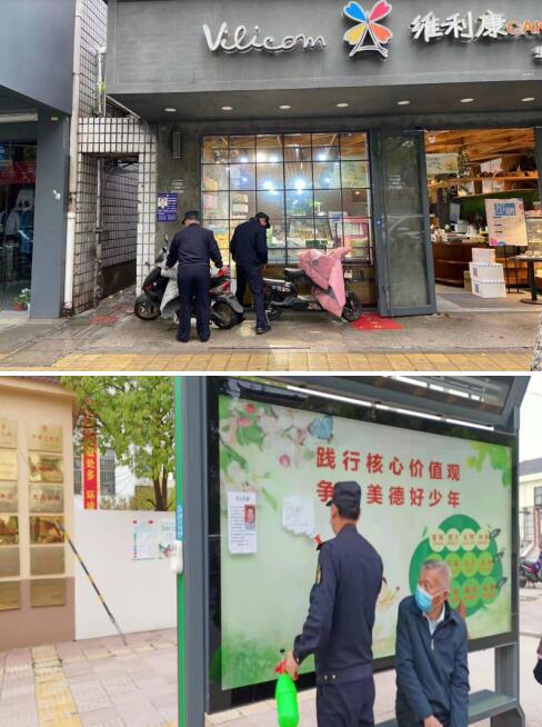 充分發(fā)揮“網(wǎng)格化”管理優(yōu)勢,定點定崗定責巡查管控轄區(qū)內(nèi)主次干道、背街小巷、農(nóng)貿(mào)市場等重點區(qū)域,對占道經(jīng)營和店外經(jīng)營商戶進行巡查,發(fā)現(xiàn)有違規(guī)行為的及時進行勸離教育,對亂堆亂放、非機動車亂停亂放、“牛皮廯”等亂象進行清理。清理中,執(zhí)法人員使用鏟子、噴壺等工具對電線桿、外立面墻體、商店櫥窗、公交站牌等公共區(qū)域“牛皮癬”進行鏟除,為轄區(qū)群眾提供整潔舒適的生活環(huán)境,維護街面秩序,提高居民幸福感。截至目前,共整治亂堆亂放、店外經(jīng)營290余處、勸離流動攤販占道經(jīng)營75處,規(guī)范非機動車亂停亂放160余處,清理“牛皮廯”70余處。
