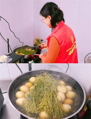 隨后,新鮮出爐的薺菜煮雞蛋被端上了桌。據(jù)說(shuō)這“三月三,薺菜花煮雞蛋”的食俗,源于三國(guó)時(shí)的神醫(yī)華佗。“這個(gè)薺菜它嫩的時(shí)候用來(lái)做野菜吃是一道十分美味的菜肴,到了三月三,這個(gè)薺菜已經(jīng)開花了、老了,但是這個(gè)時(shí)候它的藥效是最高的,所以我們采摘來(lái)煮雞蛋吃,對(duì)治療頭痛頭暈、暖胃有非常好的效果。”秦淮社區(qū)的工作人員說(shuō)道,每年農(nóng)歷三月三前后,她都會(huì)從野外采摘新鮮的薺菜,用來(lái)煮雞蛋,和家人鄰居一起分享。采摘回來(lái)的薺菜洗凈后冷水入鍋,將雞蛋鋪在薺菜上面沸煮,待雞蛋煮熟后,再加入生姜片和紅棗,轉(zhuǎn)小火燜煮。