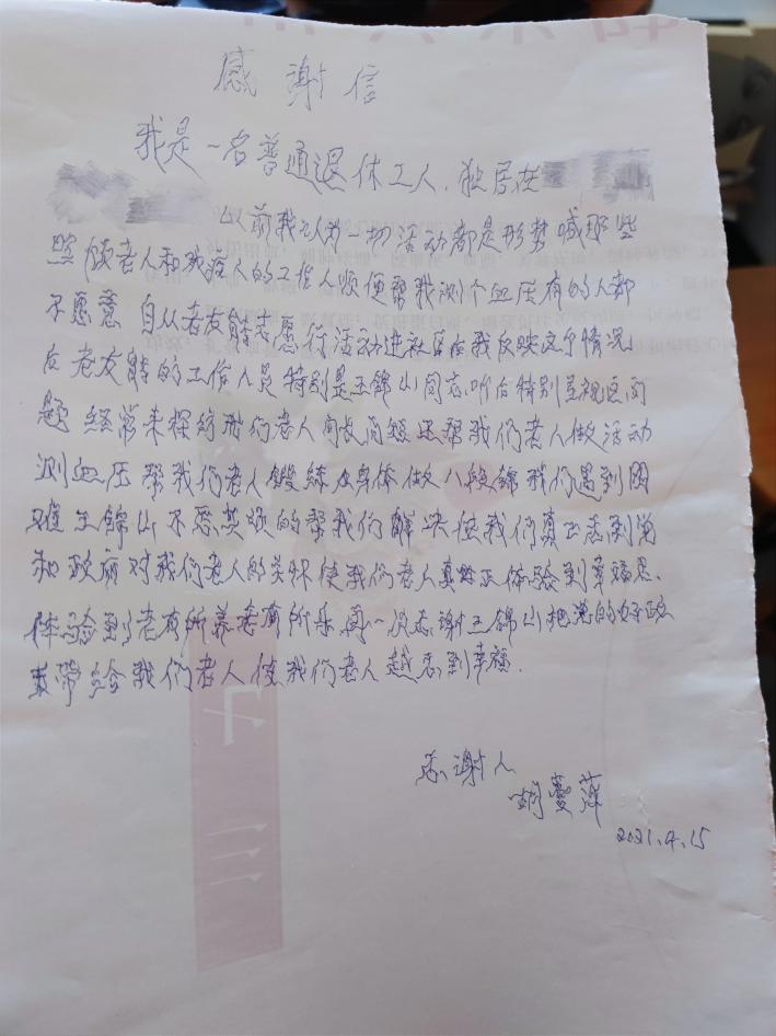 4月18日 牛首社區(qū)老友能志愿者在上門服務(wù)老人時,收到了一封意義非凡的感謝信:“以前我認為一切活動都是形式,喊那些工作人員順便幫我測個血壓,有的人都不愿意,自從老友能志愿行活動進社區(qū)后,我反映這個情況,老友能的工作人員特別重視這問題,經(jīng)常來探訪我們老人,不厭其煩地幫我們解決,使我們真心感到黨和政府對我們老人的關(guān)懷,使我們老人真正體驗到幸福感,體驗到了老有所養(yǎng),老有所樂,再一次感謝老友能把黨的好政策帶給我們老人,使我們老人越來越感到幸福。”