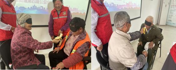 活動開始前,志愿者講解趣味游戲賽前規(guī)則,本次趣味游戲參賽項目都是根據(jù)老人的年齡和身體情況來定,共設置了“盲人吃香蕉”和“趕豬進欄”2項游戲。這些都是玩法簡單、道具便捷,娛樂性較強又無危險、比較適合老年人的項目。志愿者早早就把游戲小禮品擺放好,等待老人的到來。老人們都很開心,很興奮,游戲還沒開始,看到地上擺放好的小禮品,各個都很積極想要熱身試玩,姿勢都擺放到位,開始準備試玩?,F(xiàn)場活動氣氛融洽熱烈。老人都迫不及待的催著志愿者說,快點開始吧!