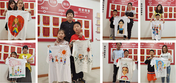 活動伊始,社區(qū)工作人員和志愿者們?yōu)榍皝韰⒓踊顒拥募彝?zhǔn)備了純白色的T恤,以及能用于衣服上作畫的丙烯顏料、顏料刷、調(diào)色盤等工具。現(xiàn)場進(jìn)行的如火如荼,大家的白T恤上逐漸多了星星點(diǎn)點(diǎn)的色彩。親子溝通、親子默契、親子情感在繪畫過程中逐漸加強(qiáng)、升溫,快樂和幸福也在蔓延。在家長與孩子的通力合作下,一件件畫好的T恤“新鮮出爐”,衣服上的媽媽惟妙惟肖,孩子們都抓住了爸爸媽媽神態(tài)或者外貌上的特點(diǎn)。“畫得很像我,謝謝我的寶貝!”活動現(xiàn)場的媽媽們綻開了笑顏。
