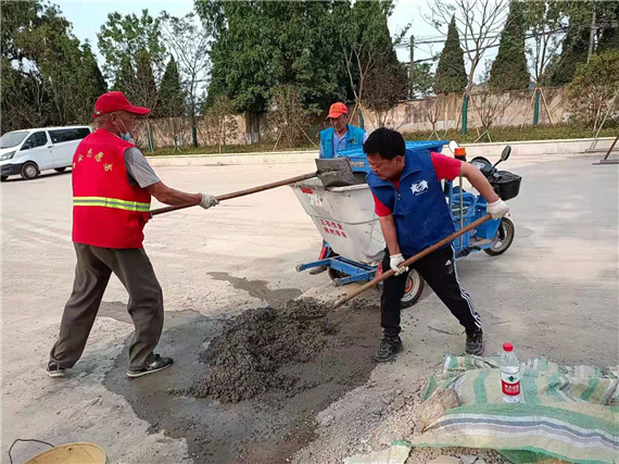 社區(qū)積極協(xié)調(diào)、多方溝通,面對路面的“不平”, 志愿者們帶上了鐵鍬、泥土沙石等工具主動當(dāng)起了修路工人,掄著鐵鍬將路面上的碎石敲開、清理,然后用水泥攪拌著細(xì)沙將凹陷處澆灌、填滿、鋪平,最后再用平鏟敲打嚴(yán)實(shí)。經(jīng)過大家的努力,路面恢復(fù)了平整,交通也變得更加順暢了。