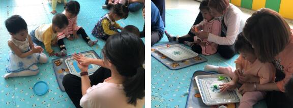 本次活動(dòng)共吸引了社區(qū)11組家庭前來(lái)參與?;顒?dòng)現(xiàn)場(chǎng),笑笑老師帶領(lǐng)寶寶們復(fù)習(xí)上一節(jié)課的模仿“小動(dòng)物走路”游戲,“小烏龜是怎么走路的呀?”笑笑老師問(wèn)。小朋友們一同回答道:“小烏龜走路爬呀爬”,小朋友們相比之前對(duì)環(huán)境更熟悉了,也更開(kāi)朗。有的小朋友還學(xué)小烏龜走路,在地上爬、翻滾,家長(zhǎng)們也在旁拿出手機(jī)記錄自家寶寶成長(zhǎng)的一幕。到了自我介紹環(huán)節(jié),有位小朋友還沉浸在上一環(huán)節(jié),迷迷糊糊介紹道:”我是小烏龜……”引得現(xiàn)場(chǎng)的老師家長(zhǎng)們?nèi)炭〔唤?。隨后,笑笑老師教小朋友們做泥塑,小朋友們?cè)诩议L(zhǎng)的協(xié)助下將橡皮泥搓圓捏扁。經(jīng)過(guò)各色橡皮泥的搭配和組合,一個(gè)個(gè)精美的泥塑成型了,有葡萄、草莓、香蕉等等。