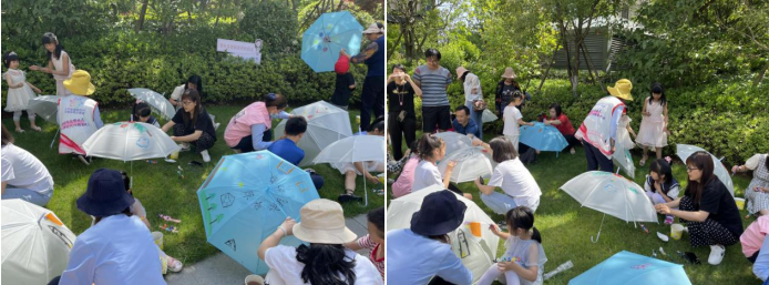 活動(dòng)一開(kāi)始,志愿?jìng)兿蚝⒆觽兘榻B了雨傘的由來(lái)及日常用處,讓孩子們了解常備雨傘的好處,并讓孩子們理解愛(ài)心雨傘的意義,孩子們認(rèn)真聽(tīng)講,現(xiàn)場(chǎng)氣氛活躍,互動(dòng)熱烈。孩子們創(chuàng)意十足,和志愿者們頻繁交流自己的想法,在繪畫(huà)的過(guò)程中彼此熟悉,志愿者們熱情的幫助讓孩子們感受到溫暖,激發(fā)了孩子們的互助品質(zhì),協(xié)作能力和動(dòng)手能力。孩子們經(jīng)過(guò)一個(gè)多小時(shí)的努力,一幅幅童趣盎然的雨傘畫(huà)呈現(xiàn)在大家的眼前,為這個(gè)夏日增添了一抹亮色,也增加了親子之間滿(mǎn)滿(mǎn)的愛(ài)意!活動(dòng)結(jié)束,志愿者們還為小朋友派發(fā)爆米花和蛋糕為孩子慶祝節(jié)日。
