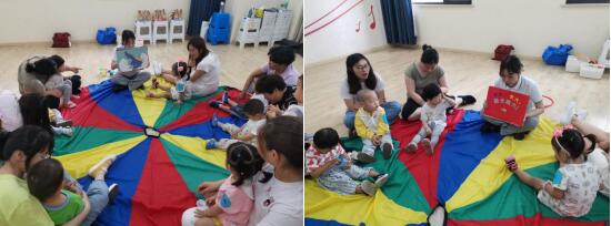 隨后,老師們帶領小朋友們做律動操《小動物做早操》,憨態(tài)可掬的動作,瞬間萌翻了一眾家長的心,讓陪同的家長們忍俊不禁。待小朋友們熟悉環(huán)境后,老師又帶領家長和小朋友們一起參與進來,從做游戲《小雞捉蟲》、《聽聲辨位》、《親子投球》,到學兒歌《夏天》,精彩的互動,讓孩子們樂在其中。尤其是繪本故事《長大長大,老師一邊讀故事一邊生動的表演著一邊和孩子們互動,引起家長朋友的一致好評,紛紛表示要向老師學習如何將繪本故事講得如此生動。