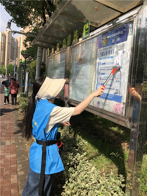 城市小廣告具有反復(fù)性、流動(dòng)性的特點(diǎn),嚴(yán)重影響市容環(huán)境,在整治過(guò)程中,志愿者們當(dāng)起了清理小能手,齊心協(xié)力對(duì)轄區(qū)小區(qū)內(nèi)的宣傳欄、信箱、樓道等存在張貼小廣告的地方進(jìn)行清理整治。志愿者們拿著小鏟子和噴壺,認(rèn)真地清理每一個(gè)廣告,不讓小廣告留下一絲痕跡,恢復(fù)轄區(qū)的干凈整潔。金陵驛社區(qū)對(duì)志愿者明確了工作時(shí)間和工作職責(zé),確保了文明城市創(chuàng)建工作有序推進(jìn),真正使志愿者參與社區(qū)工作形成常態(tài)化!