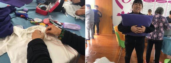 最后,大家各自分享講述自己的作品,講述著帶回家里準(zhǔn)備怎么用,有的說(shuō)腰不好可以放在椅子上靠著,有的打算坐沙發(fā)上看電視的時(shí)候抱著,有的拿回去給孩子用,有的要放在床頭靠著。大家都覺(jué)得非常的實(shí)用,家里的舊衣服有了“用武之地”。