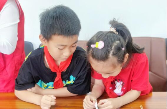 孩子們在志愿者的指導(dǎo)下,通過一針一線把香囊縫好,再放入艾葉和棉花。“艾葉可以放多一點(diǎn),有驅(qū)蚊的效果。”“收口的時候要這么縫,一抽就可以收口啦。”大家一邊穿針引線,一邊互相探討。雖然在縫制香囊的過程中,有的小朋友穿不過針線,但是大家樂在其中。