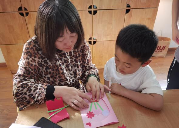 活動(dòng)中小朋友在挑選了自己喜歡的材料后,有的用卡紙折疊,剪出弧度,再分別粘貼,有的用彩色水筆寫上對(duì)媽媽說的話。在志愿者的指導(dǎo)下,小朋友們充分發(fā)揮想象力,用靈巧的雙手繪制出了一張張精美的賀卡。