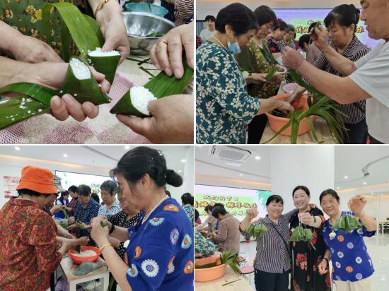 刷洗粽葉、淘洗糯米、剪扎線,現場一片繁忙景象?;顒娱_始前,社工帶大家了解了端午節(jié)的文化習俗,教大家做了端午手指操。接著,大家迫不及待的圍在一起,“舞動”手中的粽葉,非常熟練地包粽子,捋粽葉、做漏斗狀、填糯米、壓緊實、封口、扎捆,一雙雙靈巧的手把自己對生活的熱愛全都包進甜甜的粽子里。