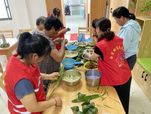 既然是端午節(jié),那粽子自然是必不可少!隨后便進(jìn)入到包粽子環(huán)節(jié)。今年的粽子可不是那么簡(jiǎn)單的,社工為大家準(zhǔn)備了提前用紫甘藍(lán)、菠菜、莧菜等多種蔬菜汁浸泡好的彩色糯米,制成獨(dú)具特色的彩色粽子?;顒?dòng)現(xiàn)場(chǎng),大家有說(shuō)有笑地圍在一起,拿粽葉、舀糯米、放蜜棗、包裹、捆扎,其樂(lè)融融。參加活動(dòng)的的戴阿姨說(shuō):“端午節(jié)的時(shí)候包粽子、吃粽子,一直是我們中國(guó)的傳統(tǒng)習(xí)俗,今天的活動(dòng)不僅讓我們感受到了濃濃的傳統(tǒng)文化氛圍,而且也使大家在互幫互助的包粽子過(guò)程中增進(jìn)了感情,拉近了彼此間的距離,這樣的活動(dòng)既有意思又有意義。”