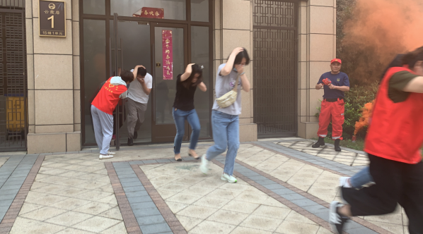 在急促的警報(bào)聲中演練拉開序幕,模擬煙霧在一瞬間籠罩了居民樓,嚴(yán)正以待多時(shí)的居民們根據(jù)工作人員的指示,緊捂口鼻貓著腰經(jīng)過安全通道有序逃生。