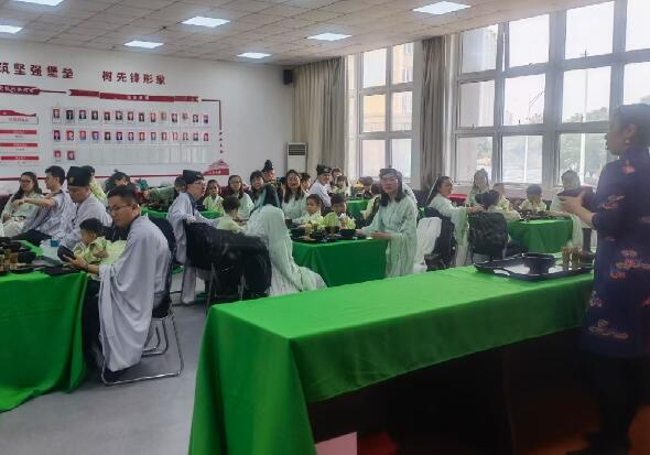社區(qū)居民更換了服裝,仿佛穿越到千年的宋朝。李老師為大家講解古禮,學習點茶技藝。孩子們按耐不住興奮之情,自己動手開始點茶,用茶筅、建盞、盞托等器具點出泡沫細膩的茶湯,給父親奉上一杯自己親手點的茶,茶淺意濃,滿滿都是關(guān)于愛的表達。