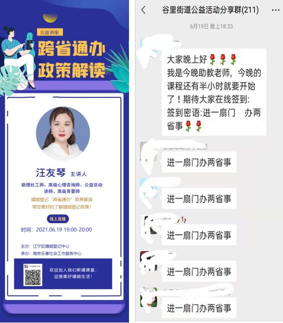 為了普及推廣婚姻登記新政策試點(diǎn)工作,于2021年6月19日晚上19:00南京江寧區(qū)婚姻登記中心聯(lián)合南京樂享社會(huì)工作服務(wù)中心舉辦婚姻登記“跨省通辦”政策解讀線上公益直播課。
