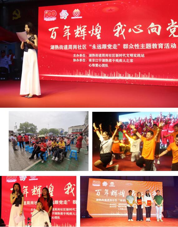 6月26日晚,由湖熟街道周崗社區(qū)新時(shí)代文明實(shí)踐站、心緣愛心團(tuán)隊(duì)及湖熟街道君子殘疾人之家聯(lián)合主辦,以百年輝煌 我心向黨——“永遠(yuǎn)跟黨走”群眾性教育活動(dòng)為主題的活動(dòng),在周崗社區(qū)黨群服務(wù)中心隆重開展。原江寧區(qū)民政局局長 江寧區(qū)善總會(huì)副會(huì)長 畢書宏、江寧區(qū)慈善總會(huì) 副秘書長 陶象銀、江寧區(qū)殘聯(lián)(兼職)副理事長 陳沛然、湖熟街道辦事處副主任 趙宏國、湖熟街道殘聯(lián)理事長李紅梅、周崗社區(qū)黨總支書記 陳武、周崗社區(qū)黨總支副書記 楊平等領(lǐng)導(dǎo)出席。現(xiàn)場特邀央視開門大吉簽約歌手-劉德華電影御用替身演員 歌手教海嘩、星光大道冠軍劉奕辰 等明星現(xiàn)場助陣。抗戰(zhàn)老兵、70年黨齡的優(yōu)秀老黨員、殘疾人家屬、扶殘助殘企業(yè)代表、愛心人士、社區(qū)居民及志愿者等幾百人冒雨堅(jiān)持參加完全場活動(dòng)。同時(shí),周崗派出所、湖熟交警中隊(duì)、周崗社區(qū)衛(wèi)生服務(wù)中心、湖熟電力公司的工作人員也挺立在雨中,保證每一個(gè)活動(dòng)參與者的人身安全,為活動(dòng)的順利開展保駕護(hù)航。