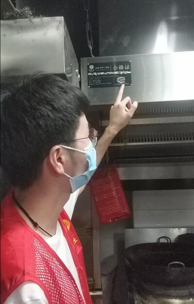 夏季高溫,餐飲店油煙排放問題增多。南京市棲霞區(qū)馬群街道蛇盤社區(qū)走訪轄區(qū)內(nèi)重點餐飲店珍筷大食堂,巡查新設(shè)備的使用情況。
