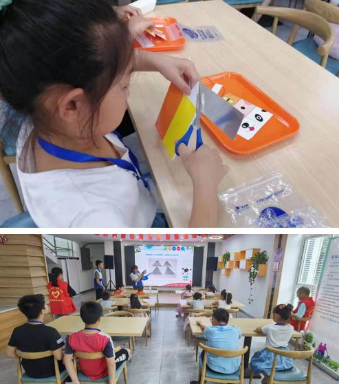 一張擁有不同動物部位的彩紙,如何把它們變成一個完整的動物呢?科普活動現(xiàn)場,橋頭社區(qū)的工作人員引導(dǎo)著孩子們進行著思考。作為這次“小魔盒”制作成功的關(guān)鍵條件,光的折射是必須要掌握的知識。從不同的圖片、日常生活示例入手,工作人員將其中原理介紹給小朋友們,讓他們能從身邊事思考其中隱藏的知識。從卡片剪裁到內(nèi)盒與外盒的拼接,再到最終成像,在工作人員的耐心講解下,小朋友們最終成功將分散的部分拼成了一個個可愛的動物頭像。
