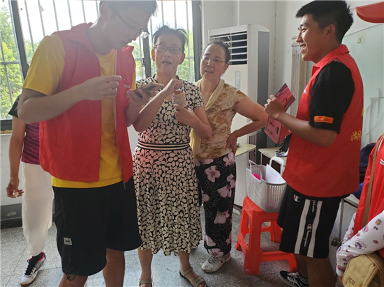 大學(xué)生們?yōu)槔夏耆税惭b合適軟件,設(shè)置親友電話(huà)快捷鍵和親友手機(jī)關(guān)聯(lián),幫助老年人更好地聯(lián)系親友。雖然炎炎夏日,但大學(xué)生們的熱情感染了居民,大家紛紛駐步圍觀(guān),給予了廣泛支持。