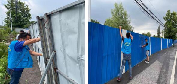 社區(qū)接到電話后,第一時間組織了城市治理志愿者帶上工具趕赴崗龍路,確定情況屬實后,志愿者們隨即用電鉆、鉗子、鐵絲等工具將倒伏和破損的圍擋進行修繕、固定。因為天氣惡劣,大風給志愿者們的工作增添了阻力,但他們沒有怨言,認真工作,互相配合,通過一個多小時的努力,圍擋得到修復,方便了來往行人、車輛的通行,同時也為他們提供了有效的安全保障。