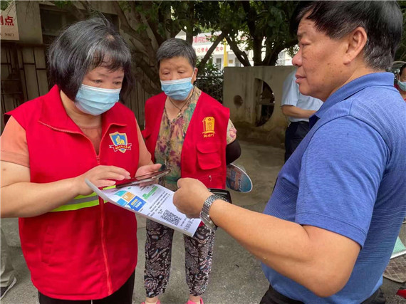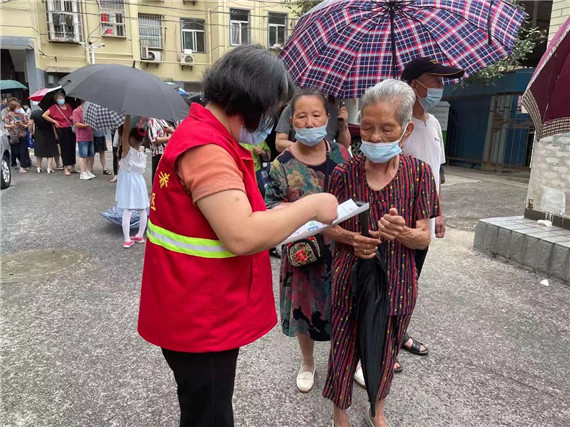 家住堯安新村小區(qū)的陳婷同志是一名退休的黨員干部。在沒有外墻的老舊車棚里,醫(yī)護人員在里面做核酸檢測,陳婷就和其他志愿者們在小區(qū)巡查,勸導居民響應號召,來做核酸檢測。烈日炎炎,大家在小區(qū)巡走半圈就汗流浹背,每天工作10多個小時,志愿者馬甲都能擰出水。