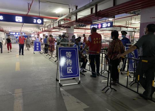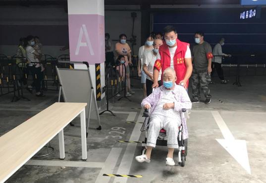 另一邊志愿者也在喊話,清點(diǎn)人數(shù),“十人一組,依次排隊(duì),不要走亂了”引導(dǎo)居民排隊(duì),為了照顧老弱病殘及婦孺,志愿者們還不時(shí)走到隊(duì)伍盡頭,看看是否有抱著孩子的婦女、腿腳不便的老人及殘疾人需要優(yōu)先安排,發(fā)現(xiàn)腿腳不便的老人和殘疾人,志愿者們第一時(shí)間來到他們身邊,攙扶著他們到采樣點(diǎn)。