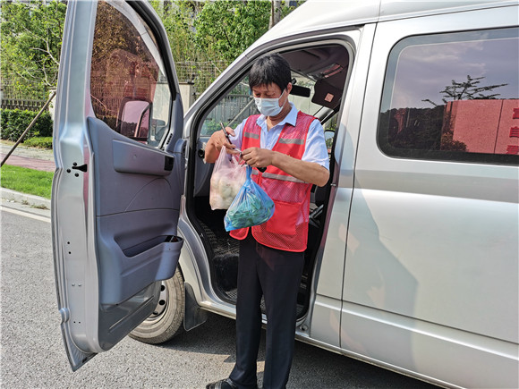 蔬菜、生活用品、快遞是居家隔離人員需求最多的幾項服務,雖然不能邁出家門,但他們通過一條微信、一個電話就可以直接“下單”,志愿者就會把他們需要的東西送到家門口。為服務好居家隔離人員的生活,攝山村委會安排專人通過“掌上云社區(qū)”微信群溝通和電話聯(lián)絡,及時掌握隔離人員的身體、生活狀況,了解各類需求。根據(jù)隔離人員的需求,村委會干部安排專車和志愿者,每天幫忙采購蔬菜、水果、雞蛋等生活必需品,到取貨點代取快遞,做好防護的基礎上,將物資配送到居民門口,確保隔離人員足不出戶、安心隔離。