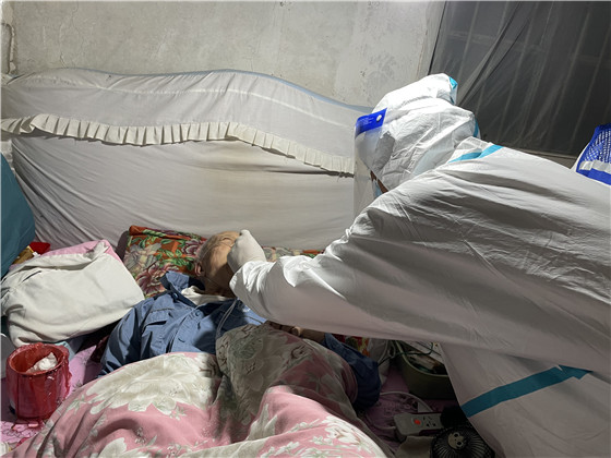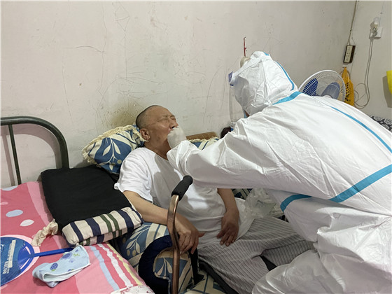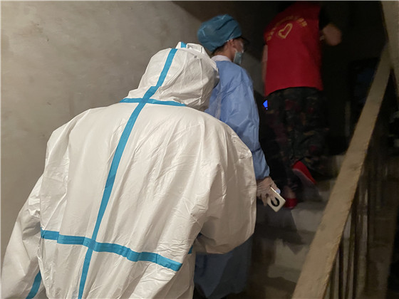 為做好檢測(cè)工作,棲霞社區(qū)精心組織、周密安排,提前逐一告知提醒這些老人們配合醫(yī)護(hù)人員進(jìn)行三次核酸檢測(cè)。社區(qū)轄區(qū)內(nèi)全是老舊小區(qū),沒(méi)有電梯,社區(qū)工作人員和醫(yī)護(hù)人員穿著隔離服穿梭在各小區(qū)中,厚重的衣服讓步伐變得沉重,采樣小組在社區(qū)工作人員的帶領(lǐng)下,堅(jiān)持爬樓三四十趟敲門(mén)入戶(hù),登記信息,咽拭子采樣,醫(yī)護(hù)人員一邊耐心地安撫,一邊細(xì)心地指導(dǎo)老人張開(kāi)嘴,小心、迅速地將棉簽伸進(jìn)老人咽部,盡量減少老人的不適感,讓老人們感到暖心、安心和放心,最后再叮囑家屬做好日常防護(hù)。“感謝你們能上門(mén)為我做核酸檢測(cè),解決了我行動(dòng)不便的難題。謝謝你們!”做完檢測(cè)的老人連聲感謝。