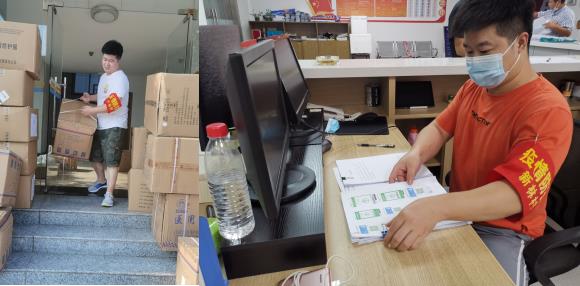 朱維新和李霞一樣,也是村內(nèi)主動報名加入便民服務(wù)小分隊的一員,他主要負(fù)責(zé)將村民網(wǎng)購的生活物品或者親友送進村內(nèi)的物品分類運輸?shù)矫恳晃淮迕竦氖种小M瑫r,他還每天在村內(nèi)進行小喇叭廣播,登記代購封控區(qū)內(nèi)村民需求的藥品。有一次朱維新穿著防護服帶領(lǐng)醫(yī)護人員上門逐戶做核酸,因天氣炎熱,朱維新半路突然昏倒在地,同行的伙伴立即將他拉至陰涼處休息,盡管身邊的同時極力勸阻他休息一會,但在他的極力堅持下,他又重新回到了自己的工作崗位,不斷當(dāng)好群眾的物資“派送員”。