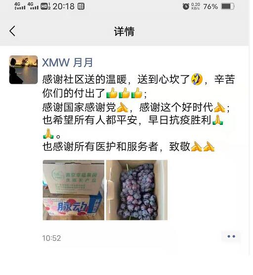“感謝社區(qū)送的溫暖,送到心坎上了,辛苦你們的付出了……”在南京市江寧區(qū)谷里街道張溪社區(qū)一位居民的朋友圈寫(xiě)著這樣一句話。自南京市出現(xiàn)新冠肺炎確診病例以后,按照有關(guān)防疫要求,需要對(duì)相關(guān)人員進(jìn)行居家隔離,由于無(wú)法自主出門購(gòu)買生活物資,該社區(qū)網(wǎng)格員楊圣琪便主動(dòng)組成小分隊(duì),幫助居家隔離人員代買生活用品以及發(fā)放一些生活物資。