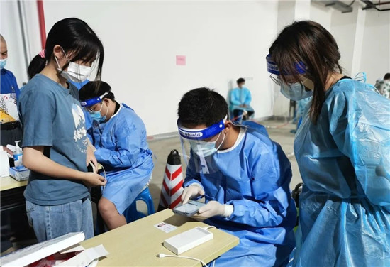 在向上社區(qū)第三輪全員核酸檢測采集點,他們有的在門口測量體溫查看健康碼;有的在現(xiàn)場引導(dǎo)維持秩序;有的在登記人員名單......
