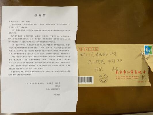 在7月31日晚8時許,實小后的教室宿舍3棟207室老太太突發(fā)不適,朱天聰?shù)弥蟮谝粫r間趕去家中并立即與120救護站取得聯(lián)系,老太太得到了及時救治。8月18日,社區(qū)黨委書記戴玉梅收到了老太太愛人杭永銘老人的感謝信,用老人家的話說:“感激之情難以忘懷,故修書一封,感謝朱天聰同志、感謝社區(qū)好領(lǐng)導(dǎo)、感謝黨的溫情。”