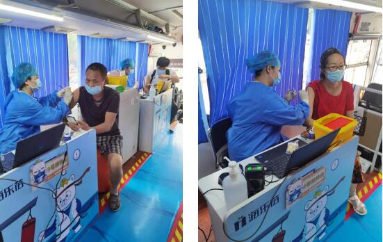 居民們向站點的以黨員干部為主的社區(qū)工作者們詢問相關(guān)訊息,進行登記之后,在移動接種車上接受了疫苗注射,避免了耗時間排長隊的煩惱,真正獲得了便利。